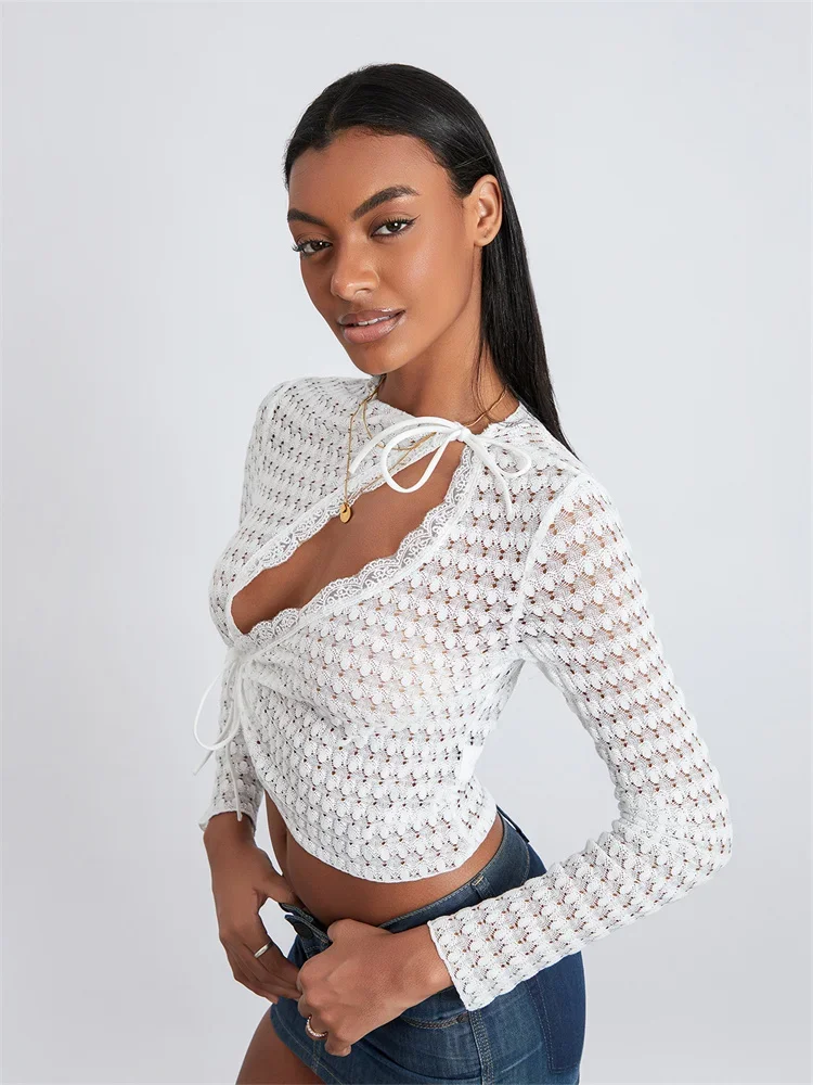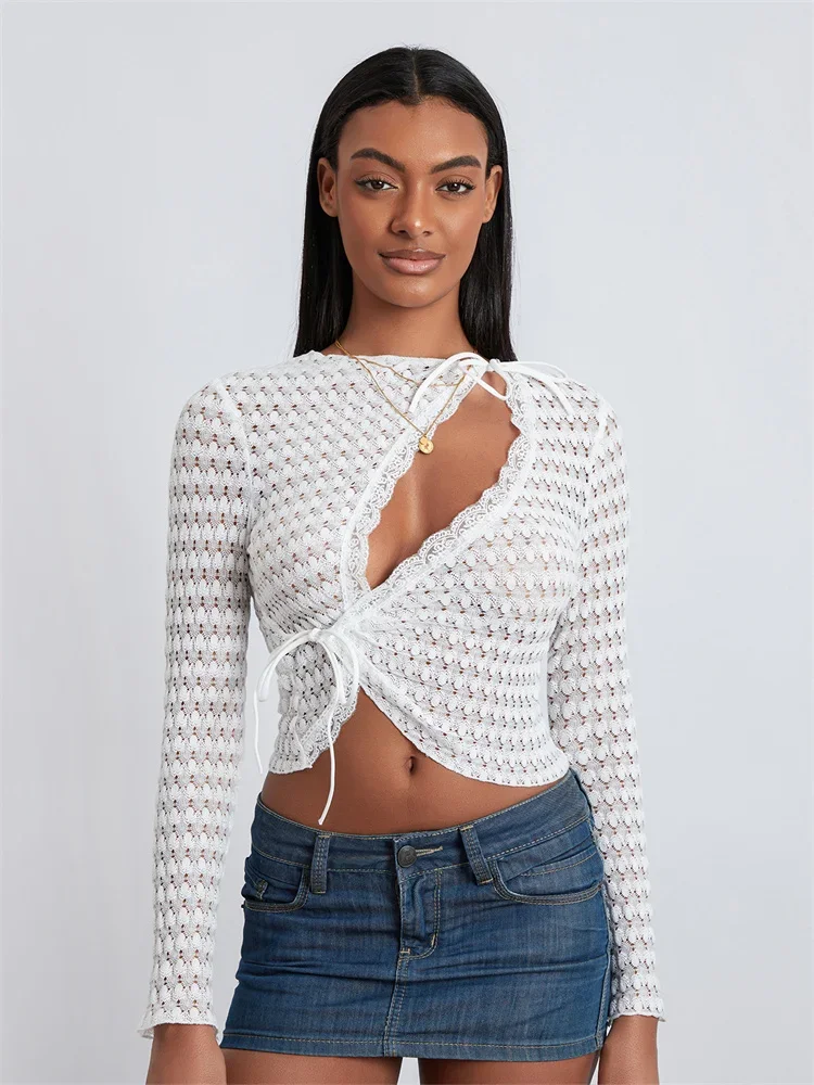 Women T-shirt, Long Sleeve Crew Neck Tie-up Hollowed Irregular Ladies Crop Top Clubwear