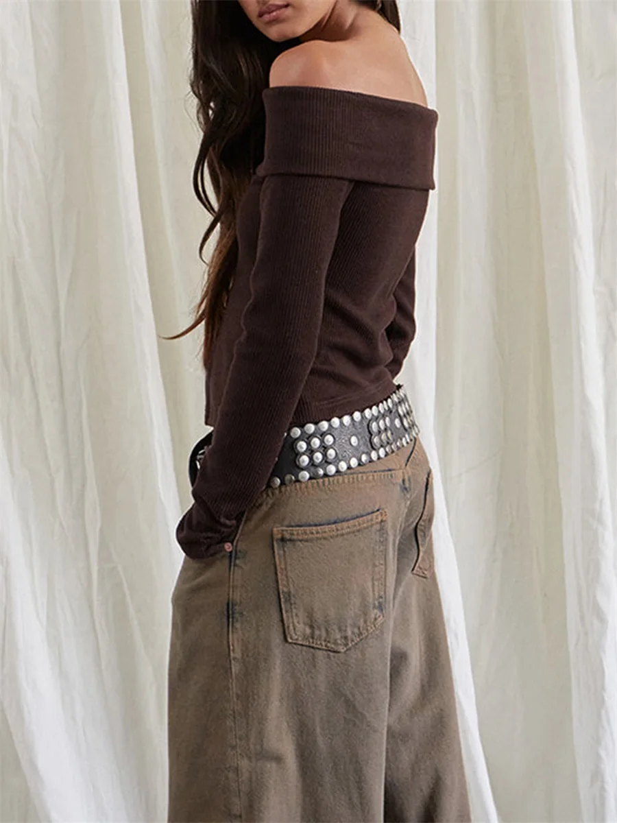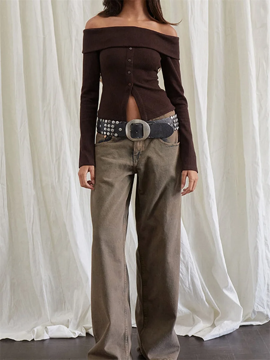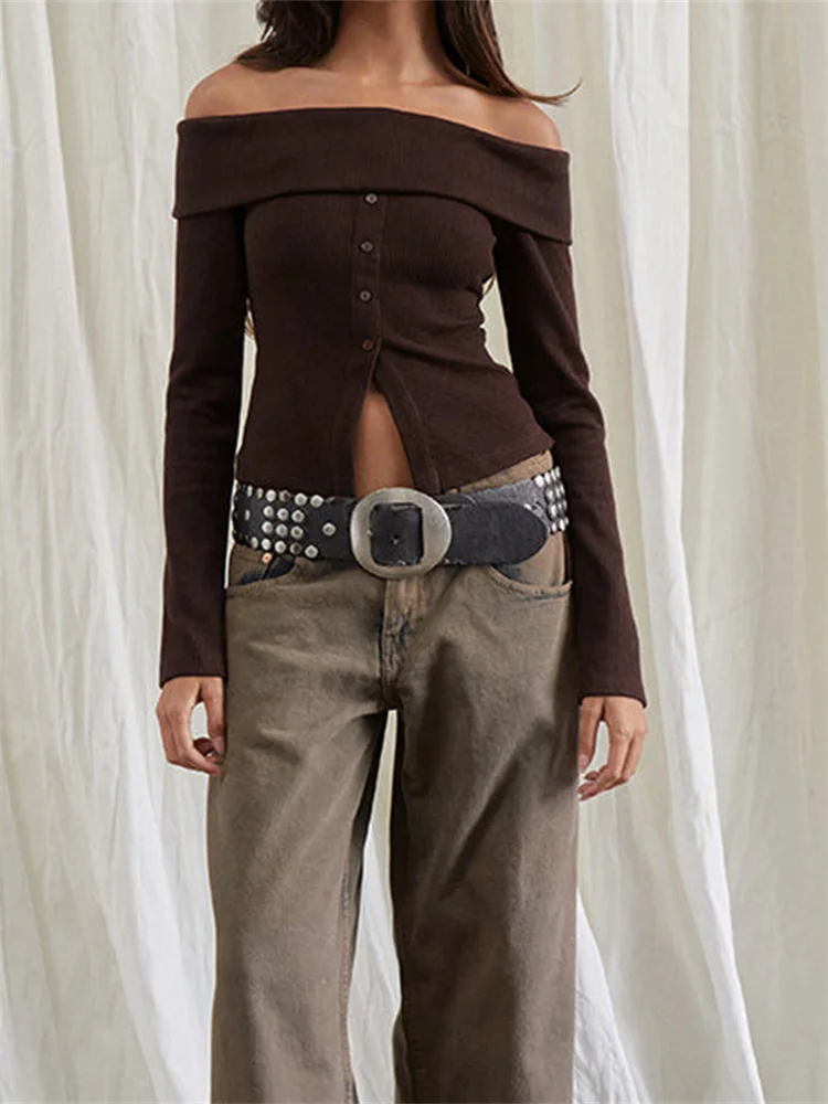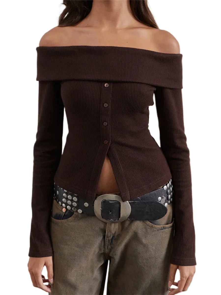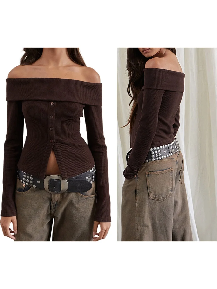 Women Knit Tops Spring Fall Blouse Long Sleeve Off-shoulder Button Closure Shirts Fashion New Knitwear Clubwear
