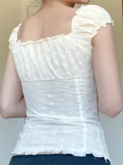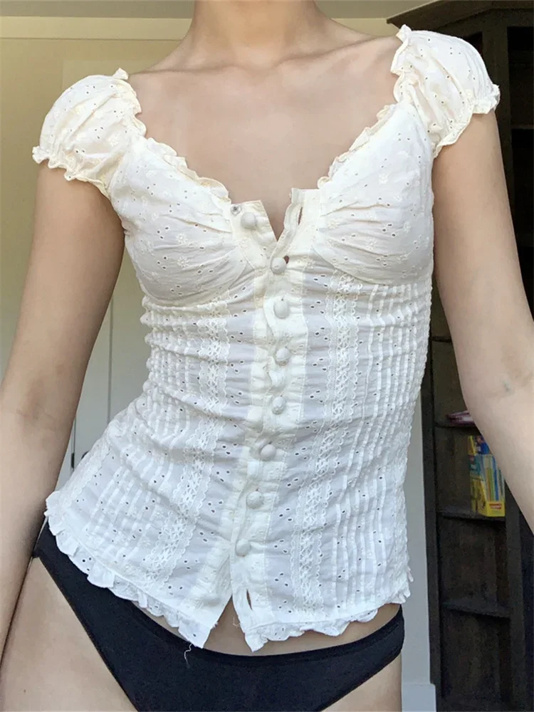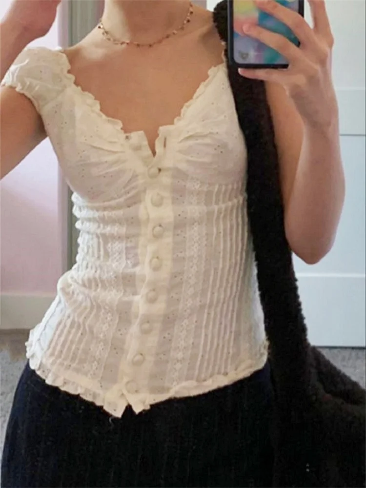 Women Fashion Solid Color Shirts Puff Short Sleeve V-Neck Blouses Summer Button-Down Casual Tops