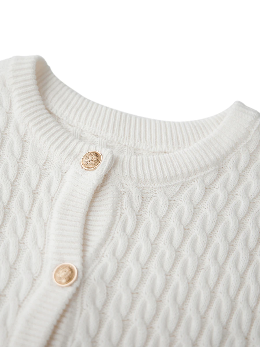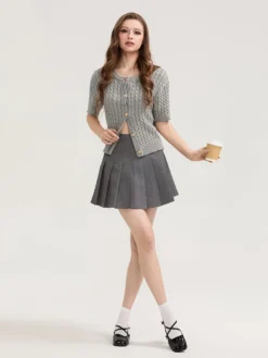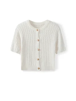Women’s Cable Knit Cardigan Solid Color Round Neck Short Sleeve Button-front Closure Crop Sweaters