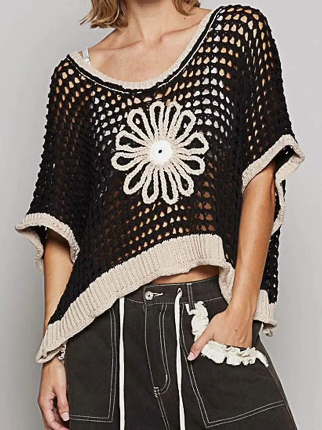 Women's Spring Summer Crochet Sweaters Half Sleeve O Neck Daisy Embroidery Hollow Knitwear