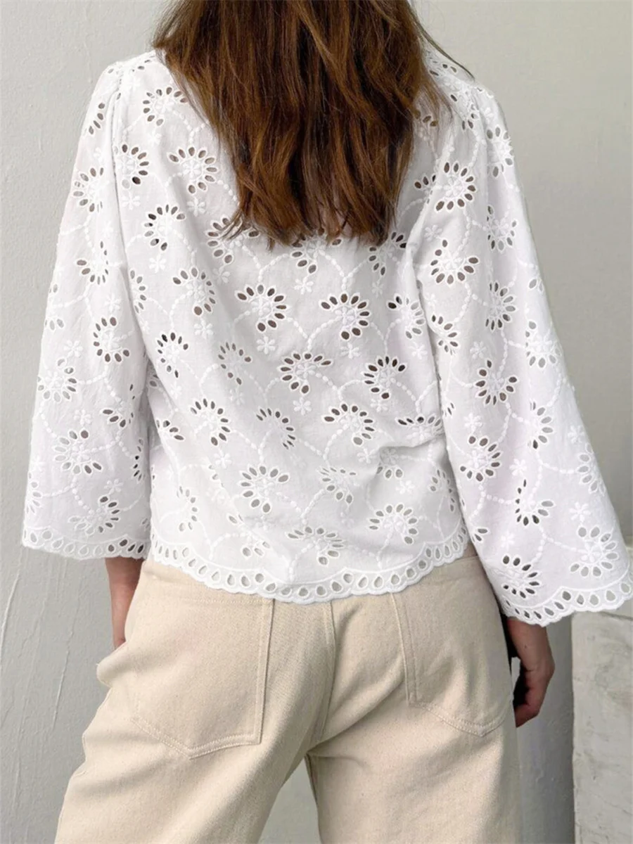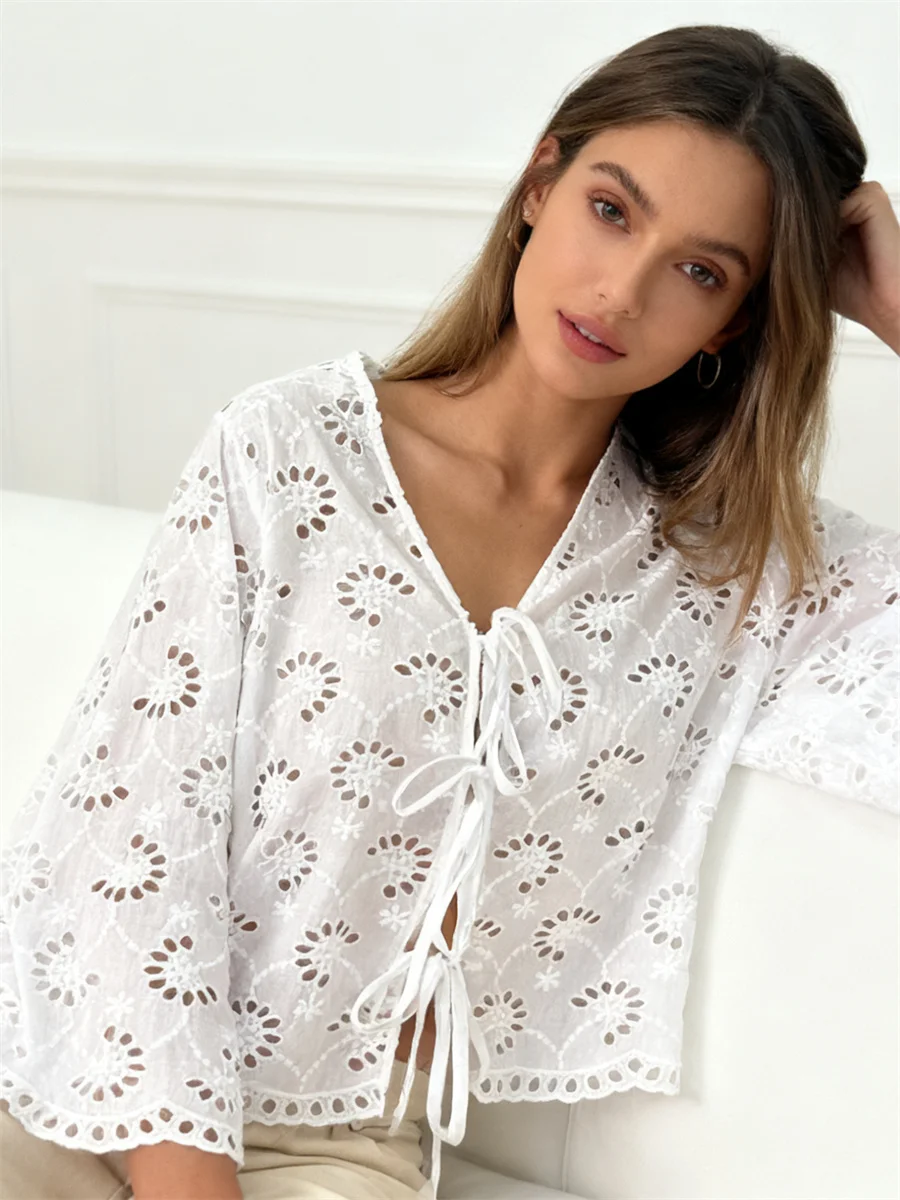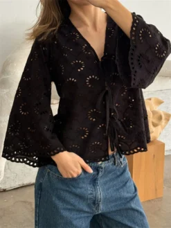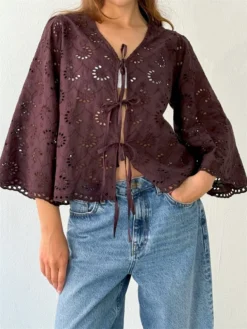 Women's Eyelet Blouse Fashionable Solid Color V Neck 3/4 Sleeve Loose Tie Front Tops