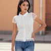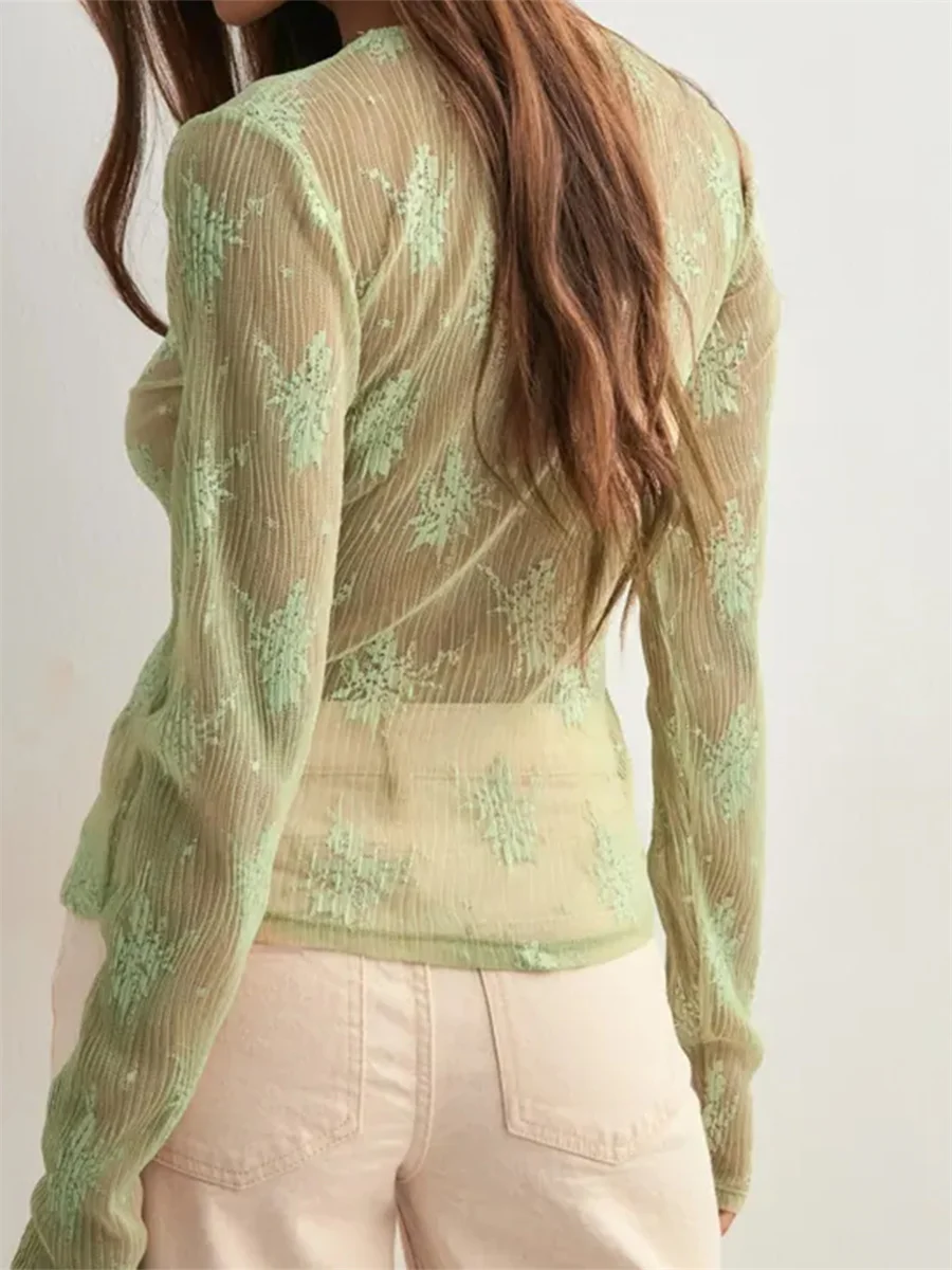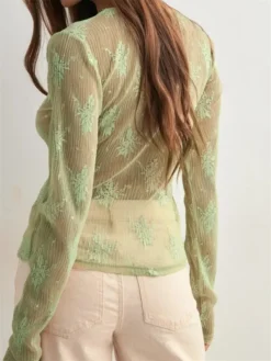 Womens Tie-up Front Tops Long Sleeve V Neck Slim Fit Sheer Lace Shirts Spring Fall Blouses