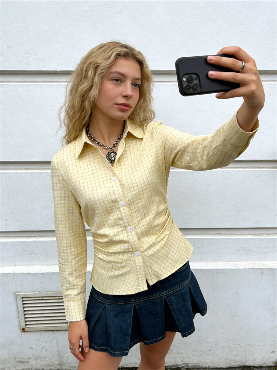 Women’s Plaid Shirts Long Sleeve Lapel Button Down Slim Fit Blouse Spring Fall Casual Street Tops
