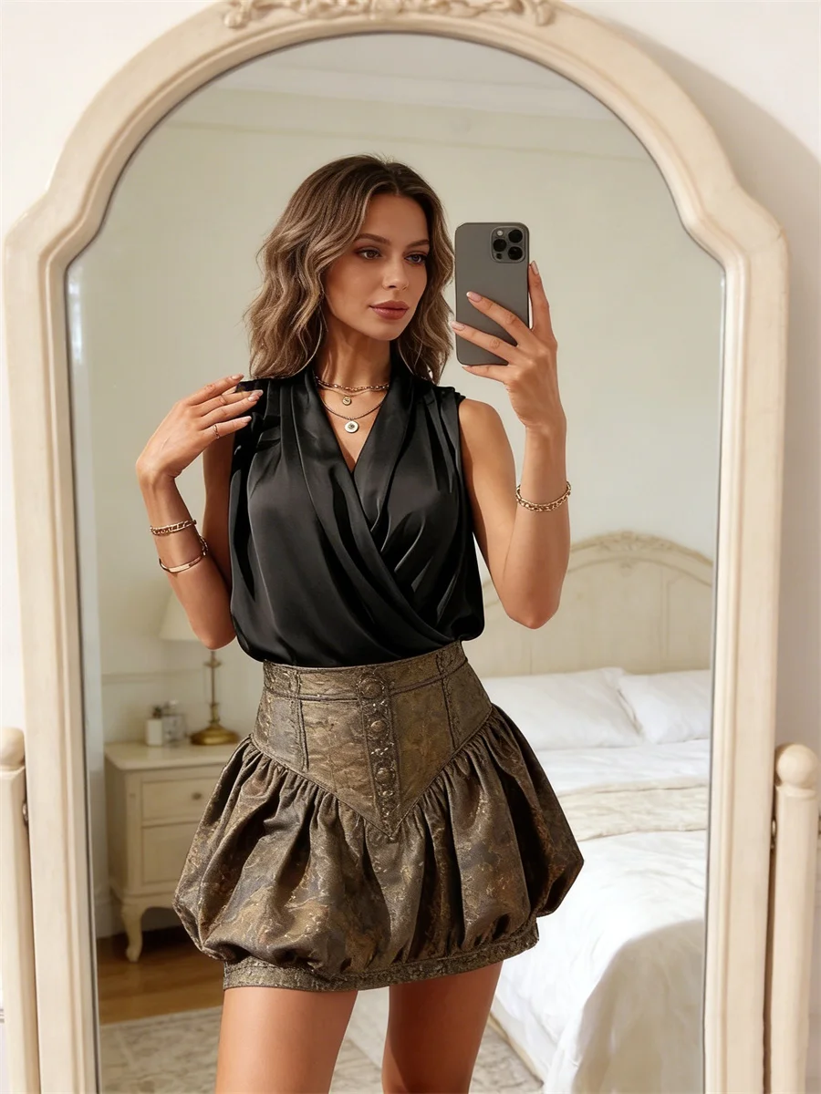 Women’s Satin Tops Solid Color Sleeveless Wrap V Neck Pleated Blouse Summer Casual Elegant Shirts