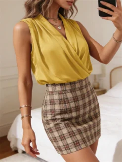 Women’s Satin Tank Tops Solid Color Sleeveless Wrap V Neck Pleated Summer Shirts